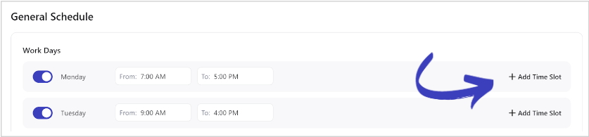 Under "General Schedule," you can add up to 2 non-overlapping time slots per day.