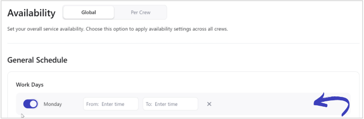 The Availability Dashboard serves as the main interface for managing your global and crew availability. It offers key functionalities such as setting global or crew-specific schedules, adding time slots, and managing exceptions.
