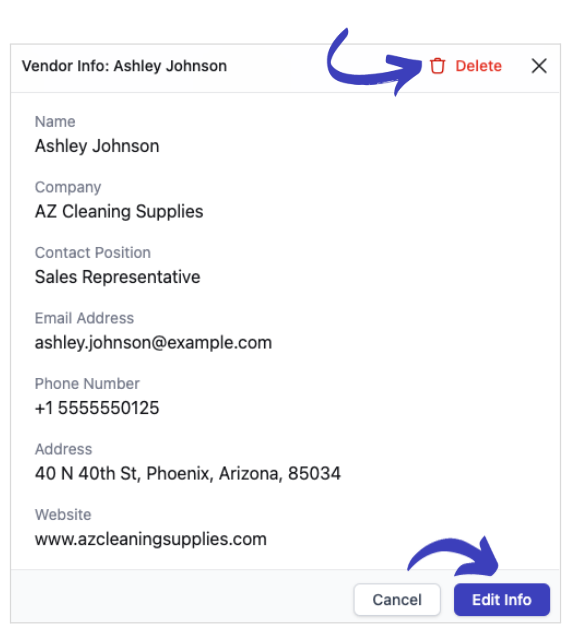 - Delete: By clicking the delete option, you will be prompted to confirm your decision. Once confirmed, the vendor will be immediately deleted. This action is permanent, so make sure you no longer need the entry before proceeding.