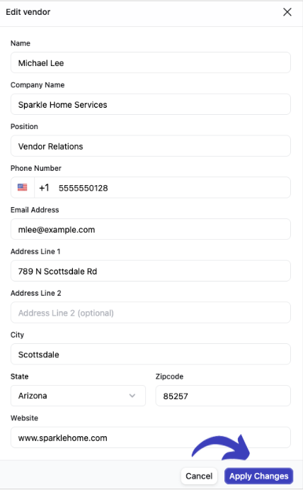 Using the edit interface, you can update any vendor’s information as needed. Modify the desired fields and click "Apply Changes" to save your updates before leaving the window.
