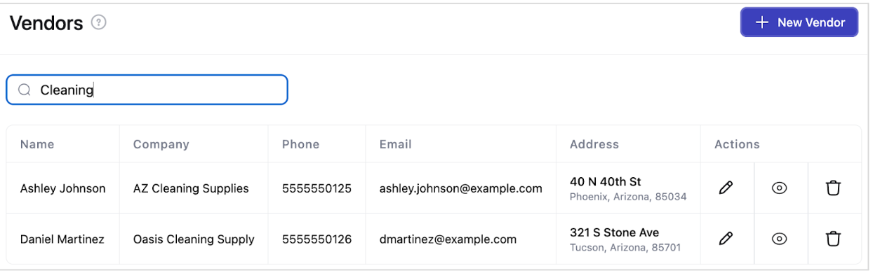 Access detailed information about a vendor by clicking the "eye icon" next to their name. This opens a window displaying all vendor details. From there, you can also edit or delete the vendor if necessary.