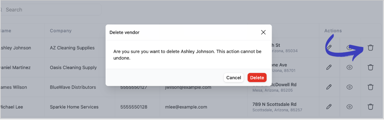 Click the "delete icon" next to the vendor’s name and confirm the deletion when prompted. The vendor will be immediately and permanently removed from your list.