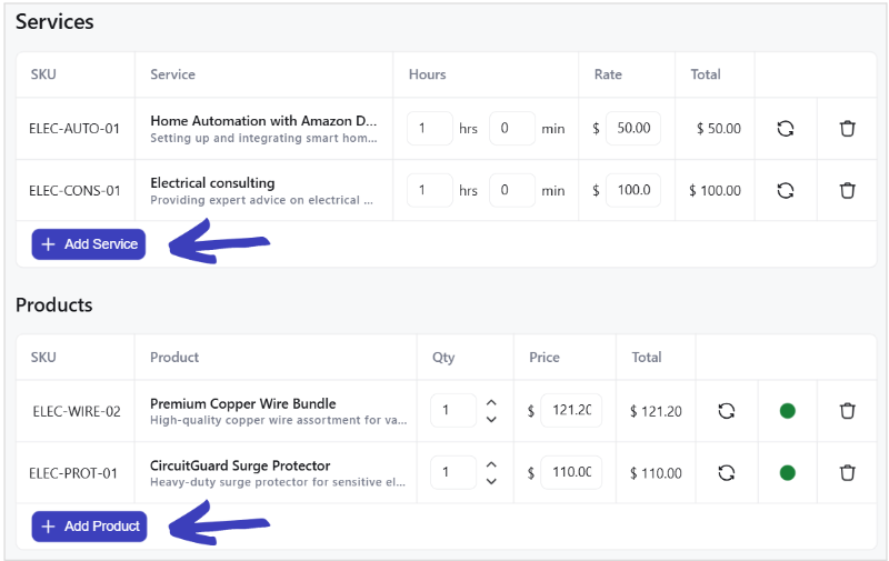 Edit Items: Modify details by clicking directly on editable fields such as "Hours" and "Rate" for Services, or "Quantity" and "Price" for Products.