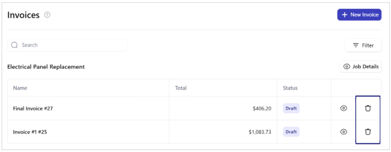 Use the search bar to quickly find a specific invoice or related job by name.