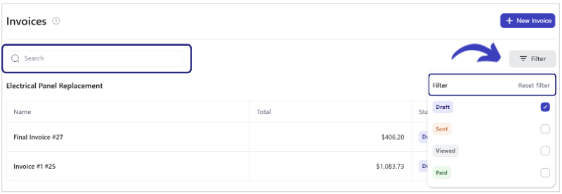 A search bar enables you to find Invoices by name or client's name. Filtering options allow you to narrow down Invoices based on their status.