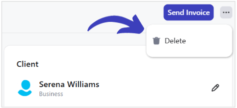 Alternatively, access the delete option from the Invoice Detail interface by clicking the eye icon, and selecting the three dots icon next to the "Send Invoice" option.