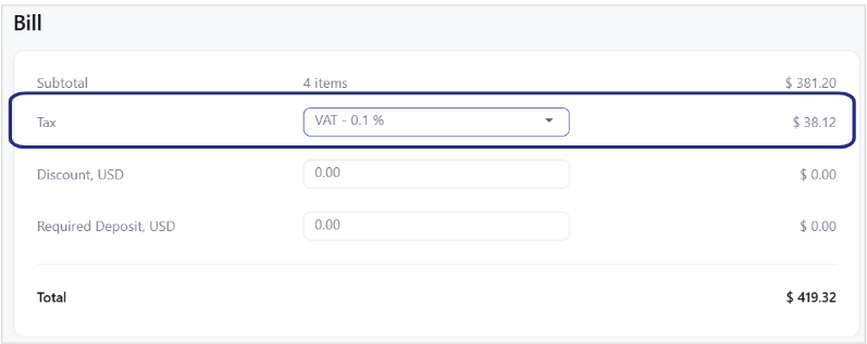 Add applicable taxes (VAT - 0.1% or GST - 0.05%).